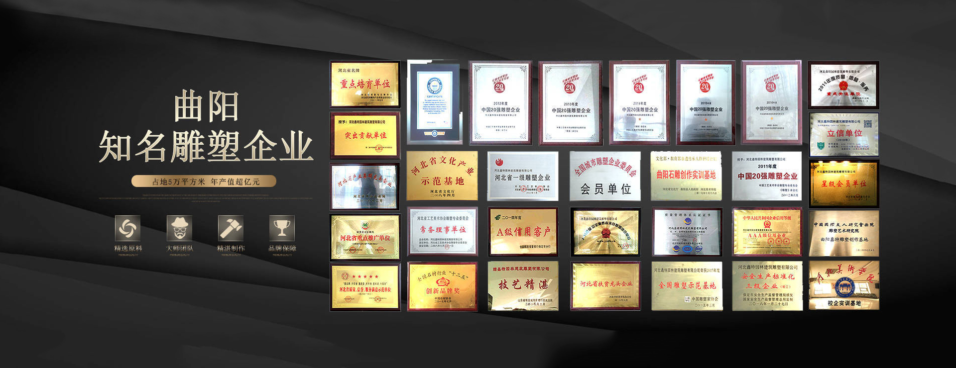 同時(shí),公司也是行業(yè)內(nèi)的佼佼者,連續(xù)七年榮獲“中國(guó)20強(qiáng)雕塑企業(yè)”,并被命名為“全國(guó)雕塑示范基地”。2017年,曲陽(yáng)縣河北鑫特園林雕塑公司還被文化部、教育部、人社部命名為“中國(guó)非遺石雕傳承人群研培實(shí)訓(xùn)基地”。